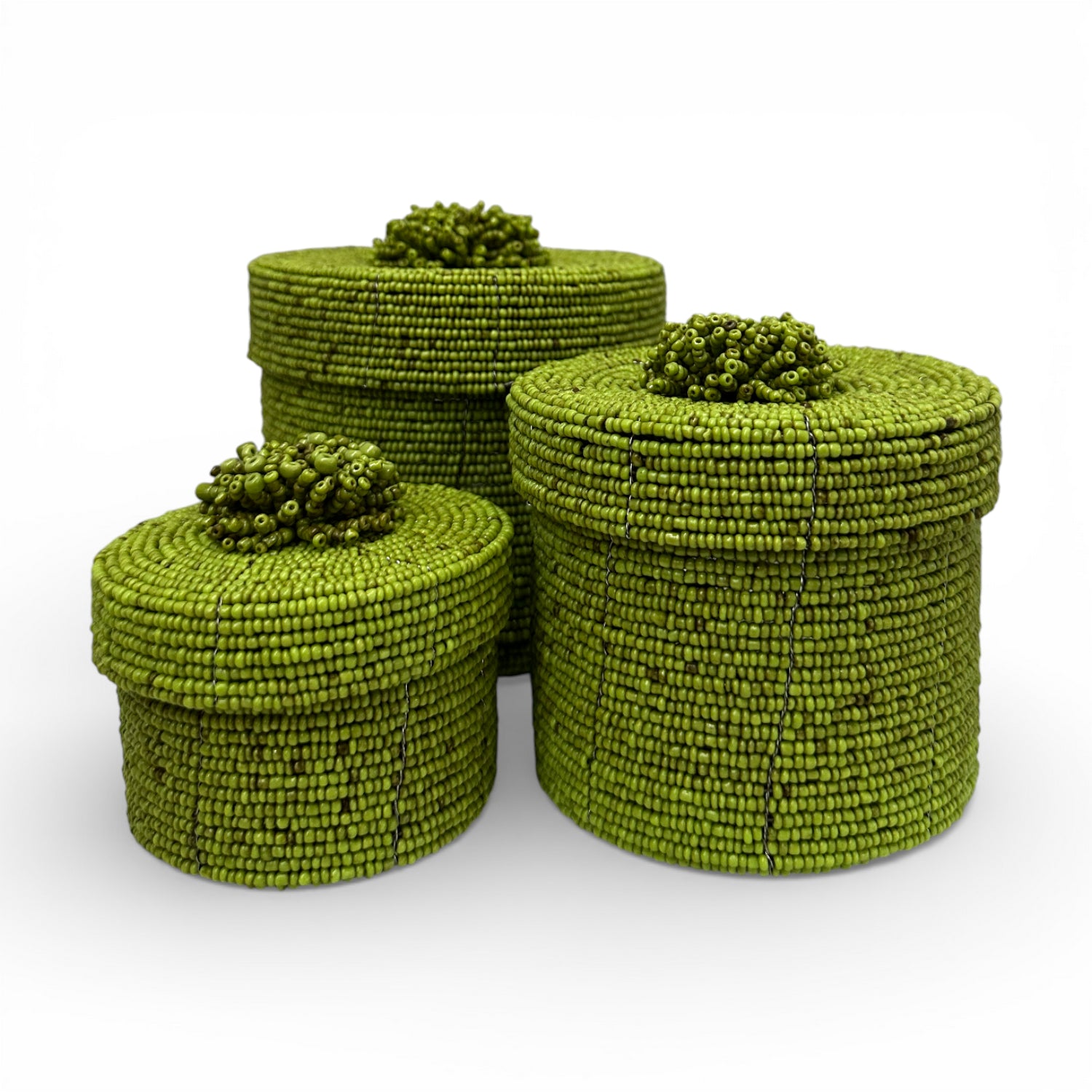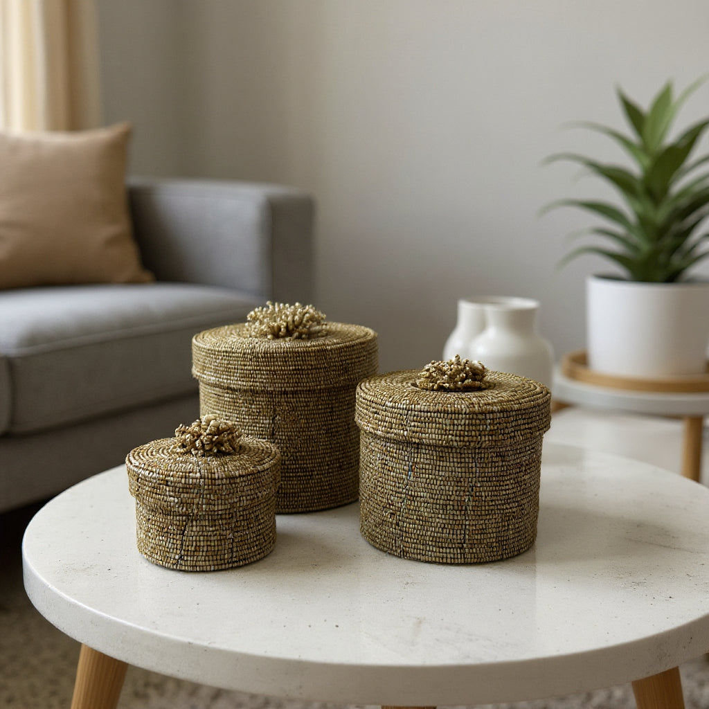 A celebration of texture, colour, and craftsmanship, these round beaded containers are both decorative and functional. Each piece is meticulously hand-beaded and topped with a matching beaded knob, offering a tactile charm that elevates any surface. Available in a curated palette of earthy and vibrant tones, they’re perfect for storing trinkets, gifting, or styling boutique displays.
