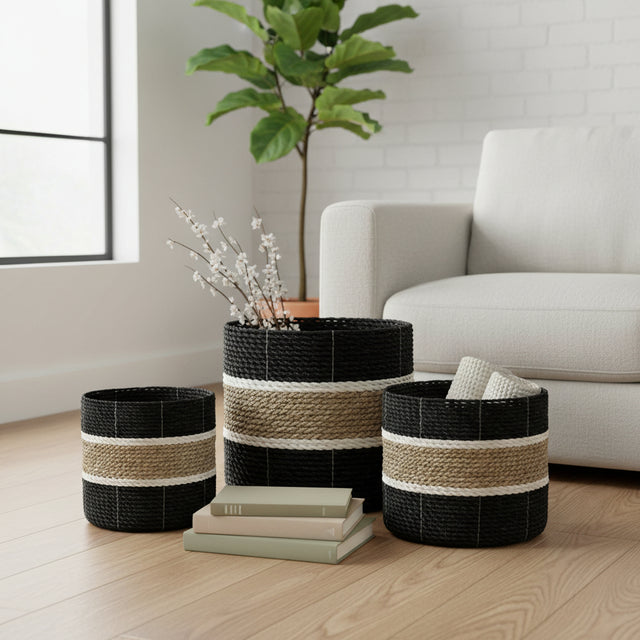 Description: Discover the perfect blend of practicality and design with this Tube Mini Basket. Crafted with precision, this basket features a tightly woven texture of durable tubes, ensuring both sturdiness and style. Its striking three-tone design combines black, white, and tan in bold sections, adding a contemporary yet versatile charm to any space. Compact and lightweight, this basket is ideal for organizing small items or as a decorative accent. Its modern aesthetic makes it an excellent addition to minimalist and eclectic interiors alike.