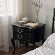 Add a touch of elegance and functionality to your bedroom with this beautifully crafted wooden bedside table. Featuring a sleek black finish, curved edges, and ornate detailing, this piece combines classic charm with practical design. The two spacious drawers provide ample storage for essentials, while the antique-style handles add a sophisticated accent. Perfect for traditional or vintage-inspired interiors, this bedside table is both stylish and durable.