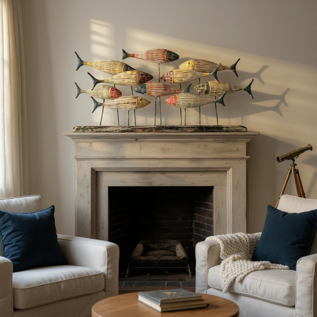 Bring a touch of coastal allure into your home with this stunning handcrafted wooden fish sculpture. Expertly crafted from quality wood, this decorative piece features a dynamic school of fish that appears to swim gracefully, arranged in a staggered formation for an engaging, kinetic display. Each fish is meticulously carved and painted, creating a lively mosaic of vibrant hues that captures the essence of an underwater scene.