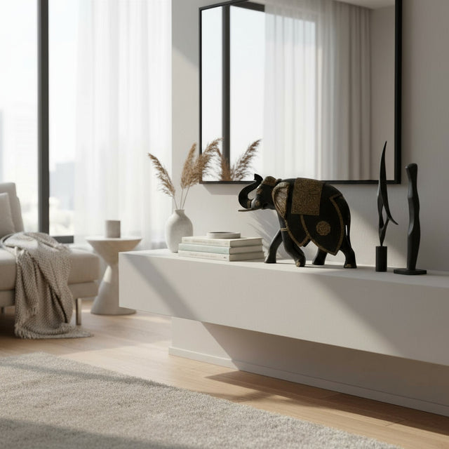 Elevate your space with this exquisitely crafted elephant sculpture, a timeless symbol of wisdom, strength, and prosperity. Hand-finished in a rich, dark-toned material, wood, it features intricate gold embellishments inspired by traditional Indian and Southeast Asian artistry. With its raised trunk and graceful stride, this piece radiates positive energy and refined elegance, making it a captivating focal point for any interior.