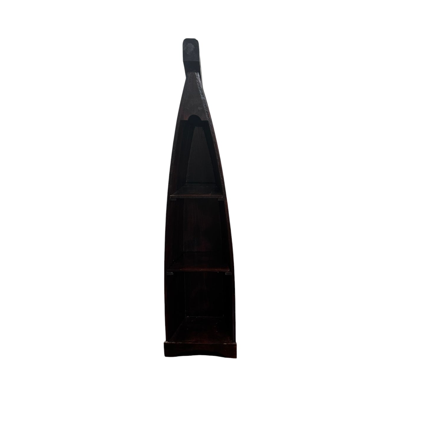 Inspired by nautical silhouettes and artisanal woodworking, these boat-shaped shelves offer a sculptural storage solution with rustic charm. Crafted from dark-stained wood and arranged in ascending heights, each piece features tiered shelving ideal for displaying curated objects, books, or decorative accents. Their unique hull-like form adds architectural interest, making them a standout addition to any interior that values craftsmanship and character.