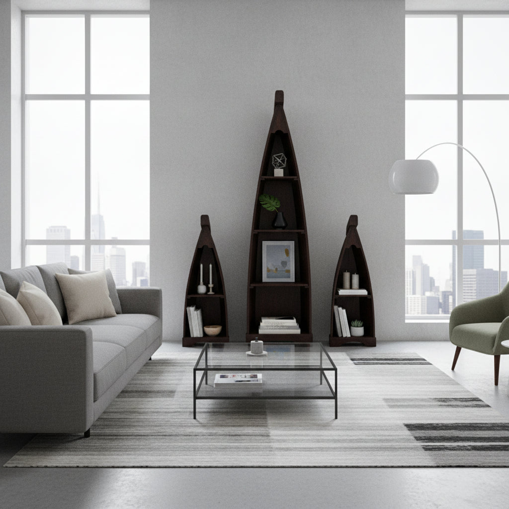 Inspired by nautical silhouettes and artisanal woodworking, these boat-shaped shelves offer a sculptural storage solution with rustic charm. Crafted from dark-stained wood and arranged in ascending heights, each piece features tiered shelving ideal for displaying curated objects, books, or decorative accents. Their unique hull-like form adds architectural interest, making them a standout addition to any interior that values craftsmanship and character.