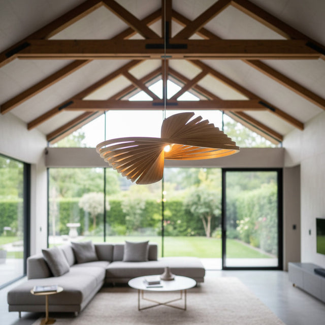 This elegant wooden light fixture is a sculptural statement piece designed to bring warmth and natural beauty into any interior space. Crafted from layered wooden slats that form a flowing fan-like shape, the light creates a striking visual effect while casting a soft, ambient glow. The natural wood finish adds a touch of organic sophistication, making it ideal for modern, rustic, or luxury interiors.