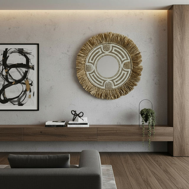 Elevate your interior décor with this exquisite mirror featuring a naturally woven fibre frame. Expertly handcrafted, the intricately arranged fibres form a dynamic border that marries traditional craftsmanship with modern design aesthetics. This mirror is not only a functional reflective piece but also a standout decorative accent that adds organic warmth and texture to any room.