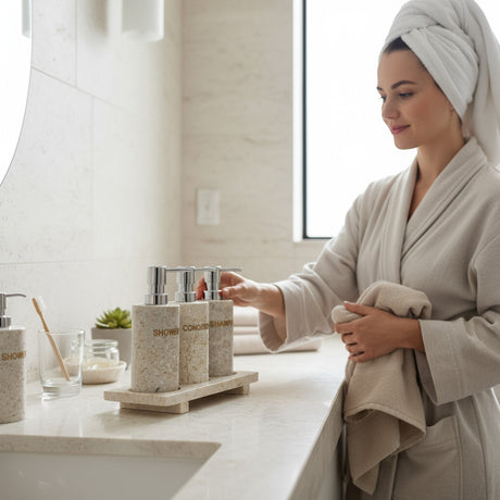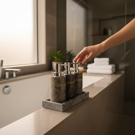 Natural Riverstone Soap Dispensers Set of 3 with Tray | Round, Cream, Marbled