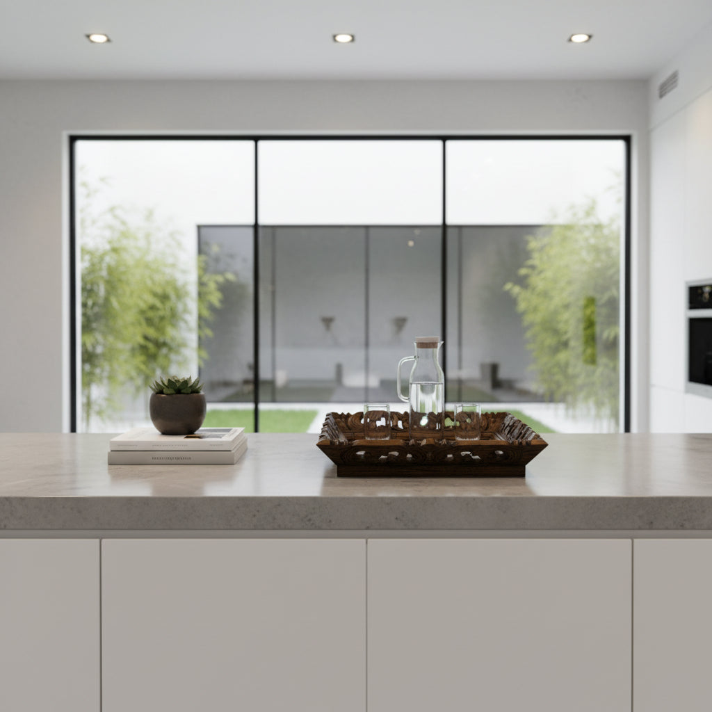 • Raised Border: Functional and decorative, keeping items secure while adding sculptural depth.