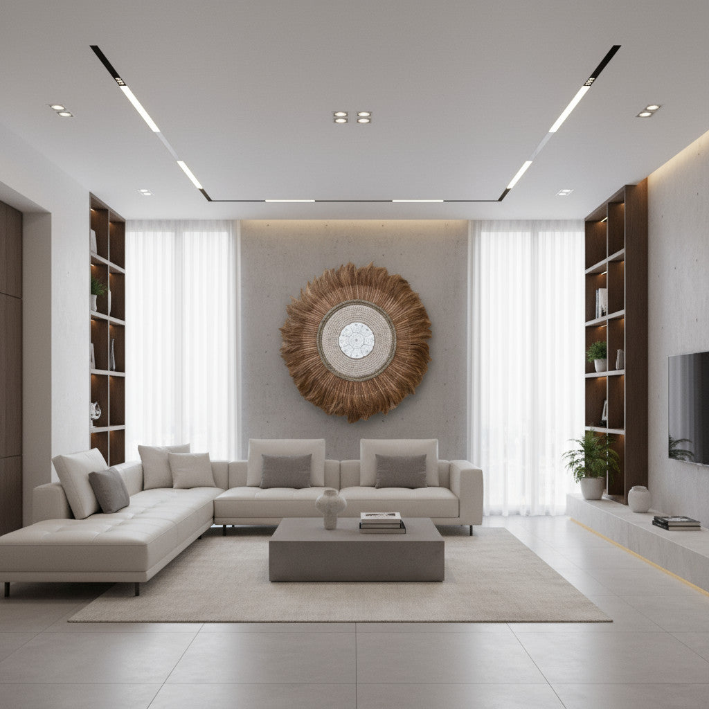 Bring warmth and texture to your space with this handcrafted sunburst wall hanging, a stunning fusion of organic materials and symmetrical artistry. At its center, a tightly woven white medallion blooms into concentric rings of braided brown fibers, culminating in a radiant fringe that mimics the softness of feathers or sun rays. Suspended from a delicate chain, this piece adds movement, depth, and a grounded elegance to any wall it adorns.