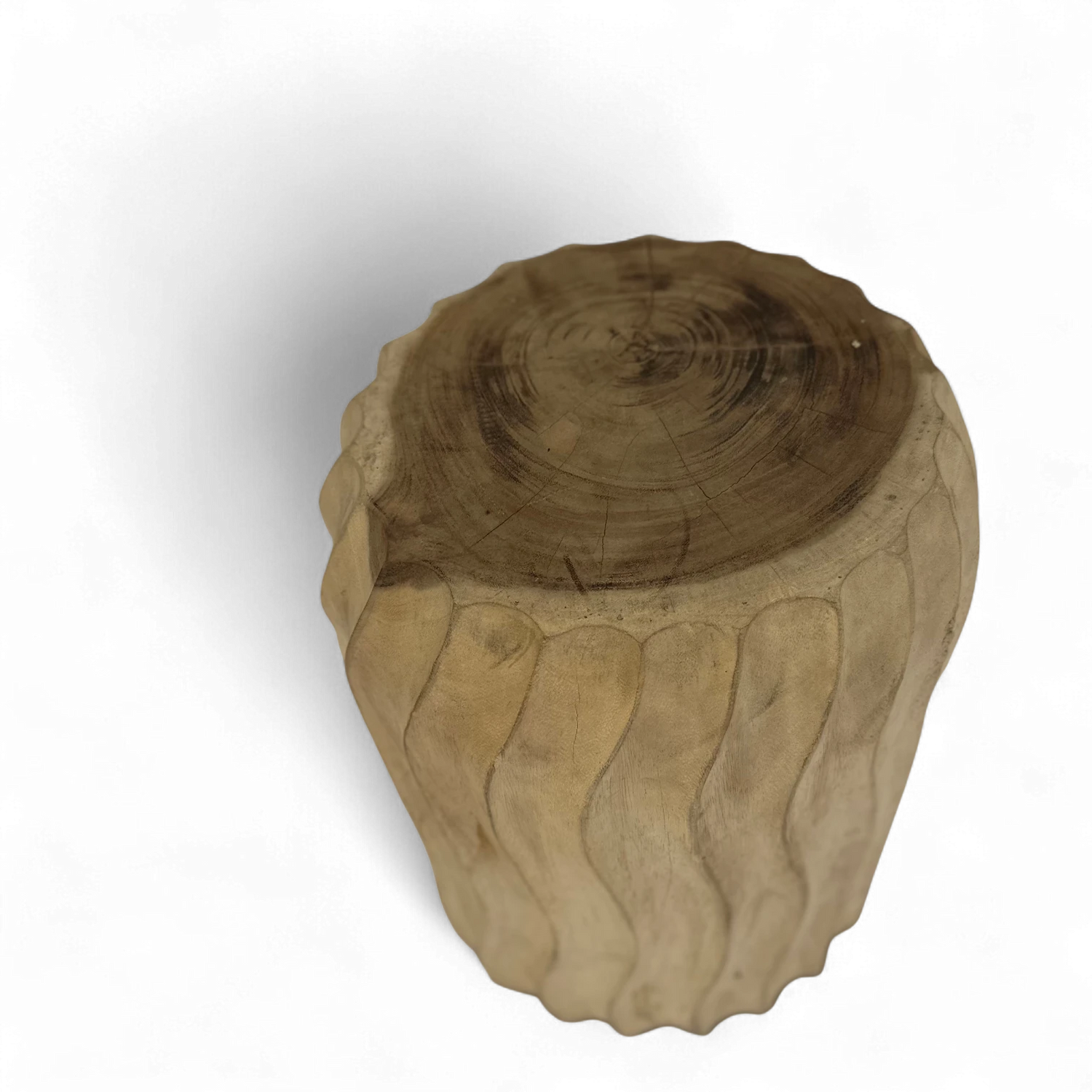 This handcrafted wooden stool is a striking blend of form and function. Its cylindrical silhouette is wrapped in a wave-like carved texture that adds depth, movement, and tactile appeal. Made from solid wood with a natural finish, the stool showcases the beauty of organic grain while offering a versatile surface for seating or display. Whether styled as a side table, accent piece, or minimalist perch, it brings sculptural elegance to any interior.