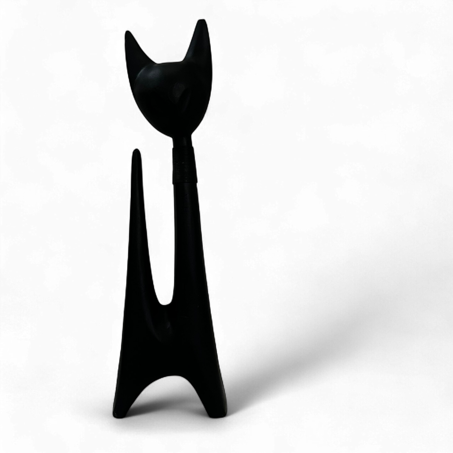 A charming blend of modern abstraction and handcrafted detail, this small wooden cat sculpture brings playful sophistication to any curated space. With a sleek black body featuring stylized eyes and a delicate nose, the piece is elevated by a subtle black necklace detail, adding character. Mounted on a minimalist stand, it’s perfect for display on shelves, pedestals, or boutique counters where artistic storytelling meets refined decor.
