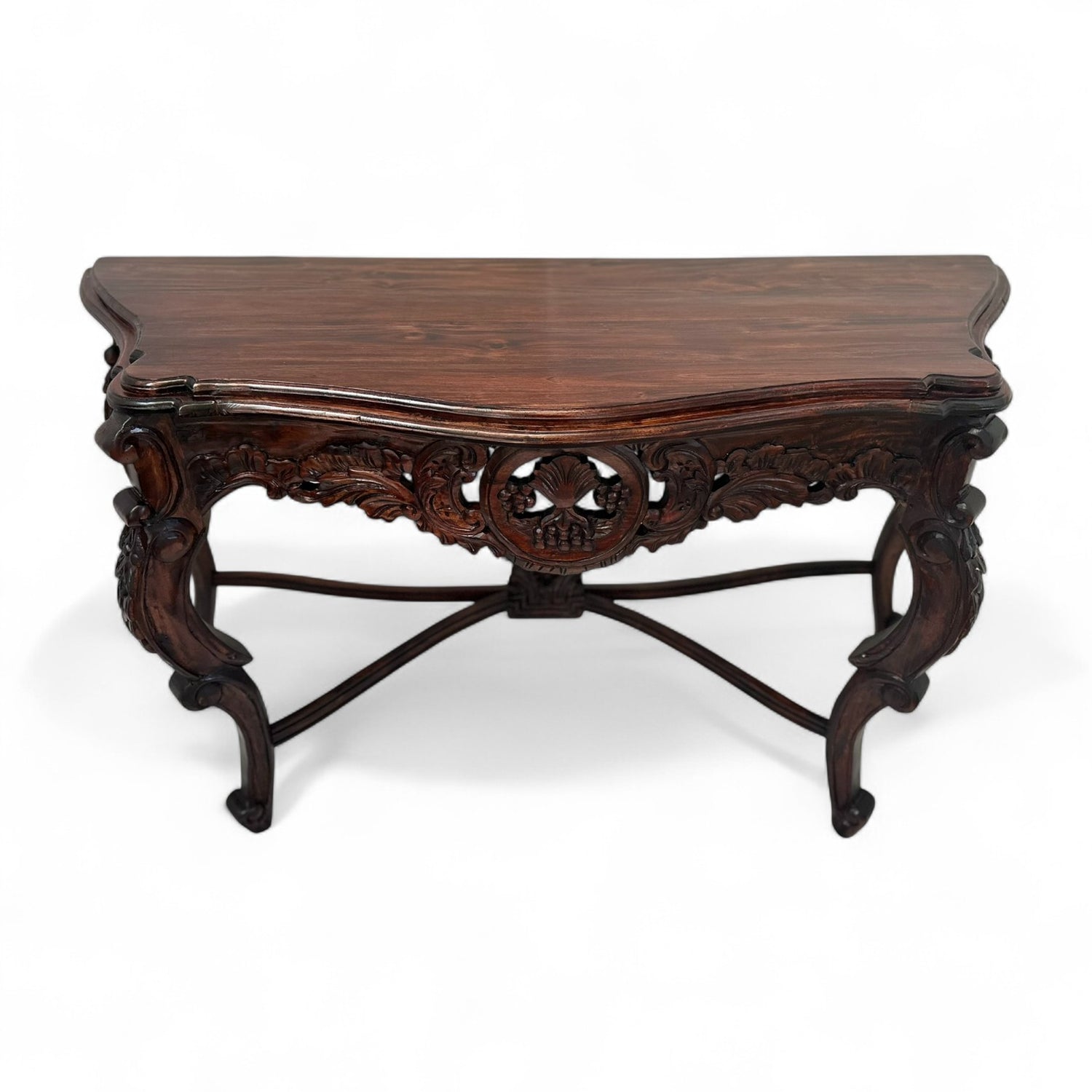Add a touch of sophistication to your home with this exquisitely crafted wooden wine console. Featuring a rich, dark wood finish and intricate hand-carved detailing, this piece is a perfect blend of elegance and functionality. Its ornate design make it an ideal statement piece for dining rooms, living spaces, or wine cellars. Whether used for displaying fine wines or as a decorative console, it brings timeless charm to any setting.
